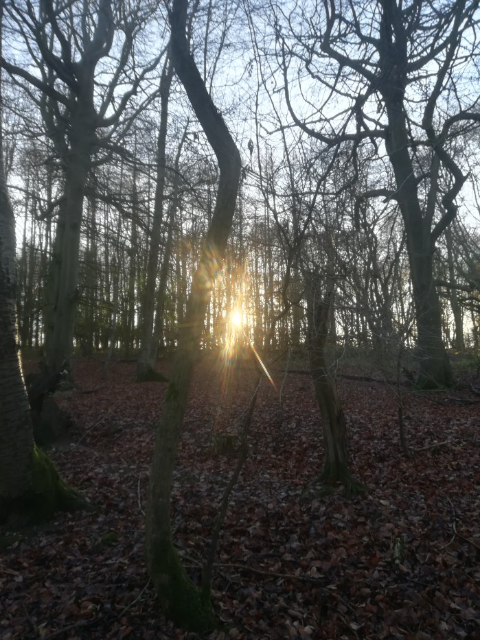 Here is a picture of the wood with the early morning sun coming through the trees at the top of the wood. It so happened that the sunlight was “spotlighting” the two tress that I had planned to work on.