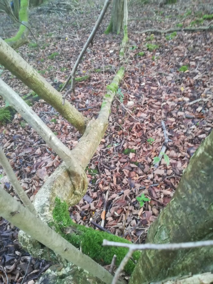 One of the less obvious plants with an ability to stick together is the hazel and its spindly new growth branches. It is many years since any work has been done on the coppice and some of the hazel trees are very mature. Their canopy has become entwined with its neighbouring hazel tree and also stuck into the lower branches of the ash, cherry and hawthorn. What I have found out is just how incredibly resilient these entangled branches are to being separated. In some instances I have cut the main trunk of a limb and the tree has simply swung from its base and hung suspended by its upper branches and their strong entwined grasp of other branches. The harder you pull the tighter the “knot” becomes.