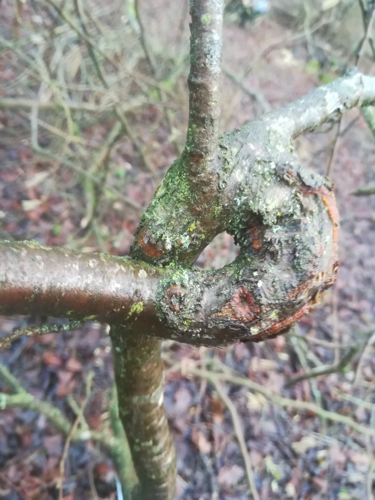 Whilst coppicing I spotted the branch below that had occurred naturally on a standard hazel tree. The branch has grown in a complete circle and started to fuse back onto itself where it crosses. Strange but attractive.