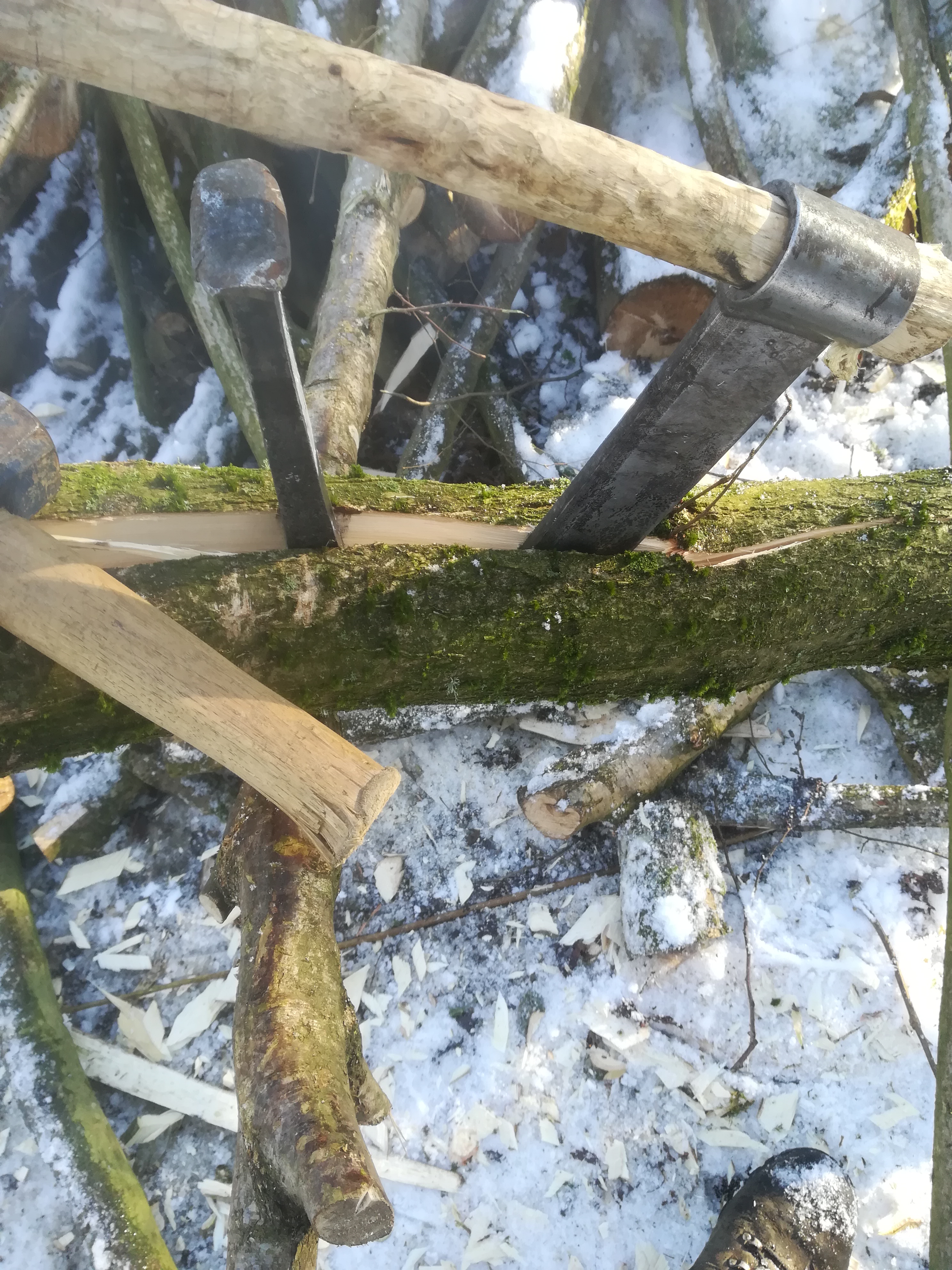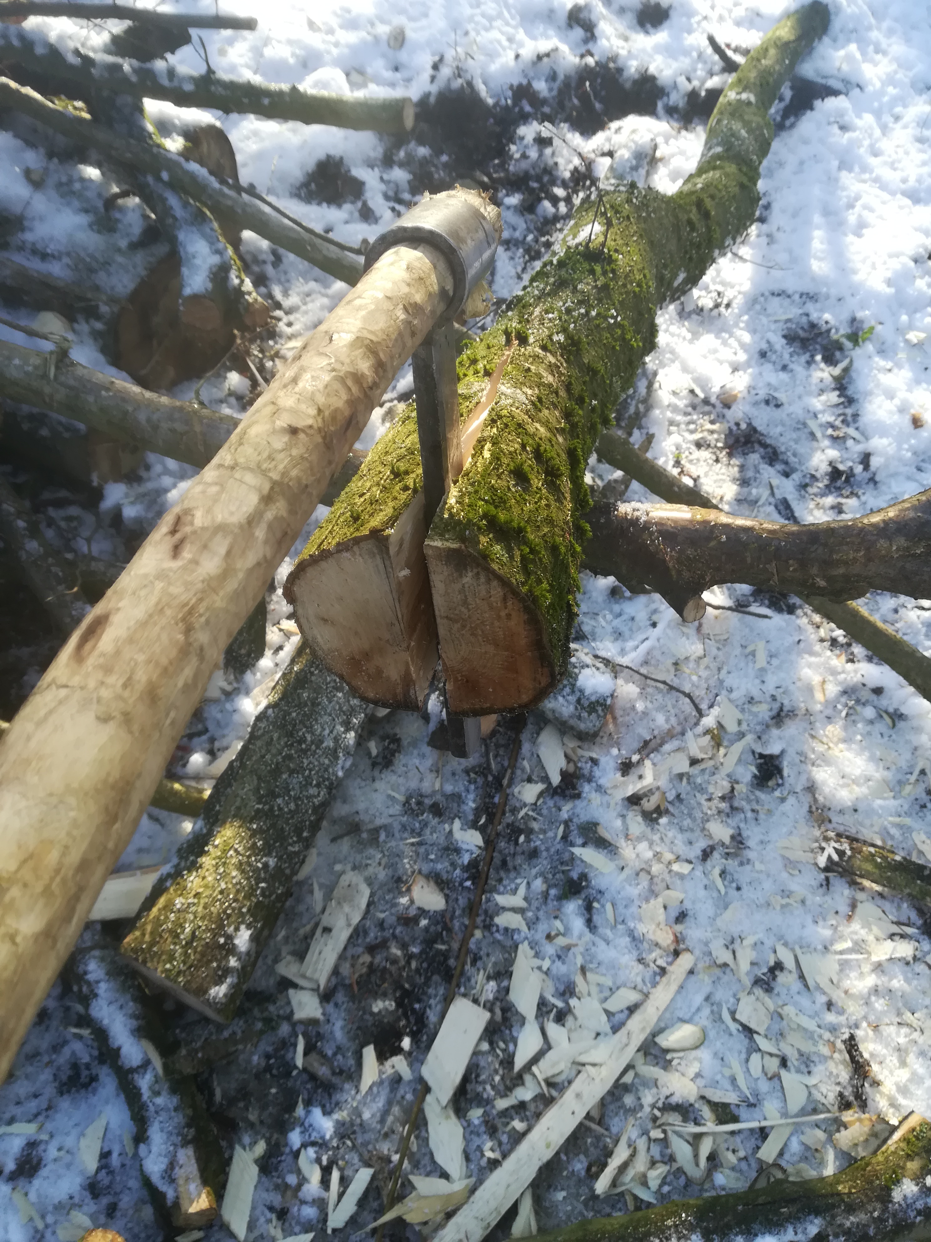 The fro can then be reinserted ahead of the wedge and it in turn used to widen and advance the split and so release the wedge and so on down the whole length. It is sometimes necessary to cut through strands that don’t split but remain tensioned across the split. You can use a saw or if there’s room get in with the bill hook. Just be careful not to hit the wedge or fro if you use the bill hook!