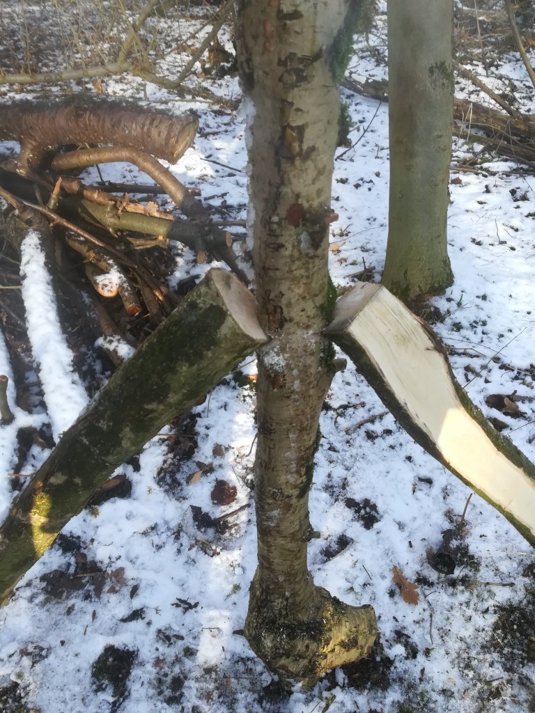 Today’s task was to carry on with the fencing off of the hazel coppice. First job is to create the fence posts. Here the hazel stems that were coppiced from the existing stools come in, each decent sized stem can be used but they just needs some preparation.