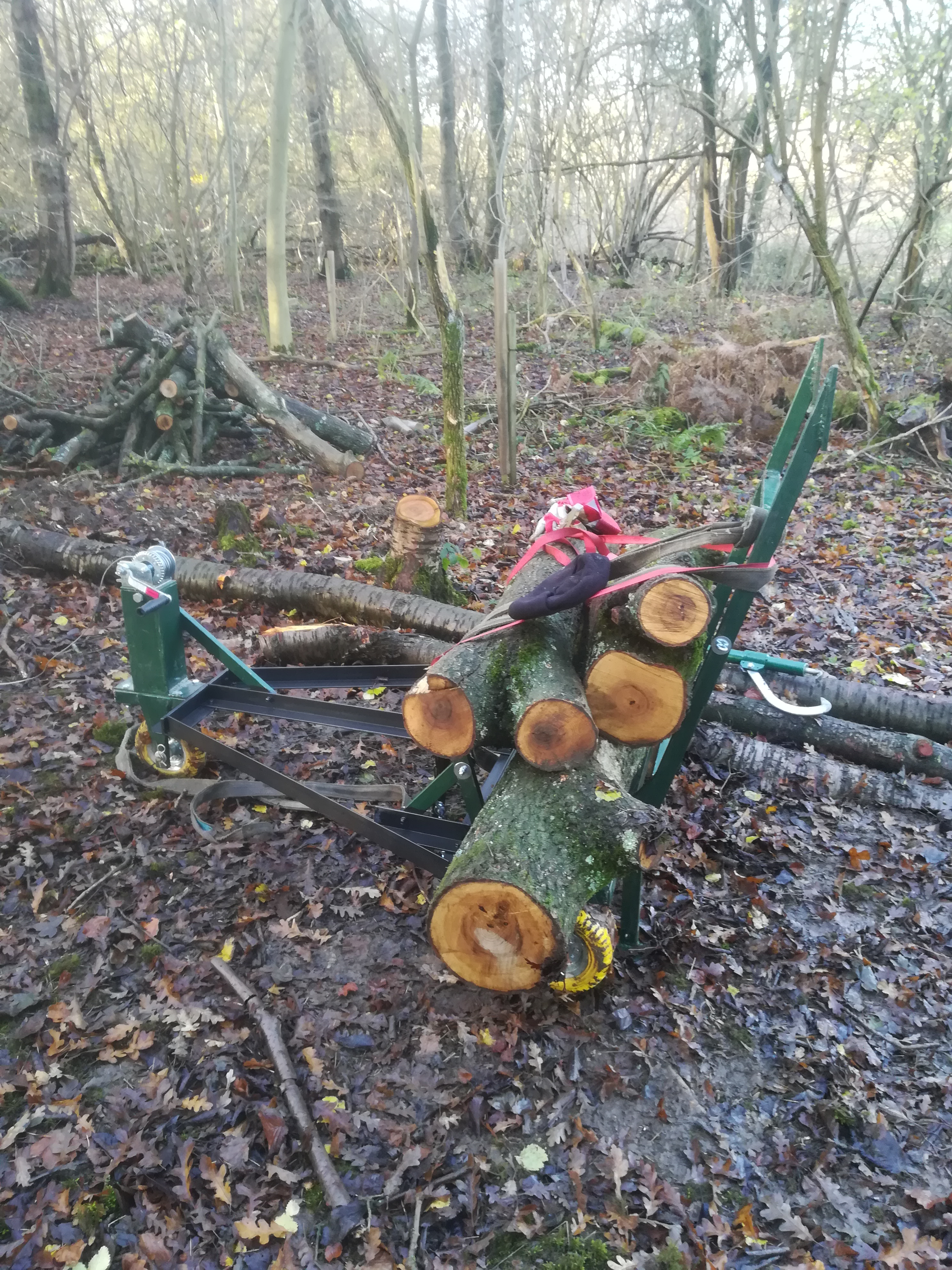 Moving the sections of tree that I have cut down from the coppice area is proving to be a very time consuming and tiring task. I have taken down six or seven mature wild cherry trees and also the remains of a partially collapsed ash tree. On the positive side there is a lot of good quality timber to be milled from these logs; on the down side they are very heavy and difficult to move across fairly rough terrain.