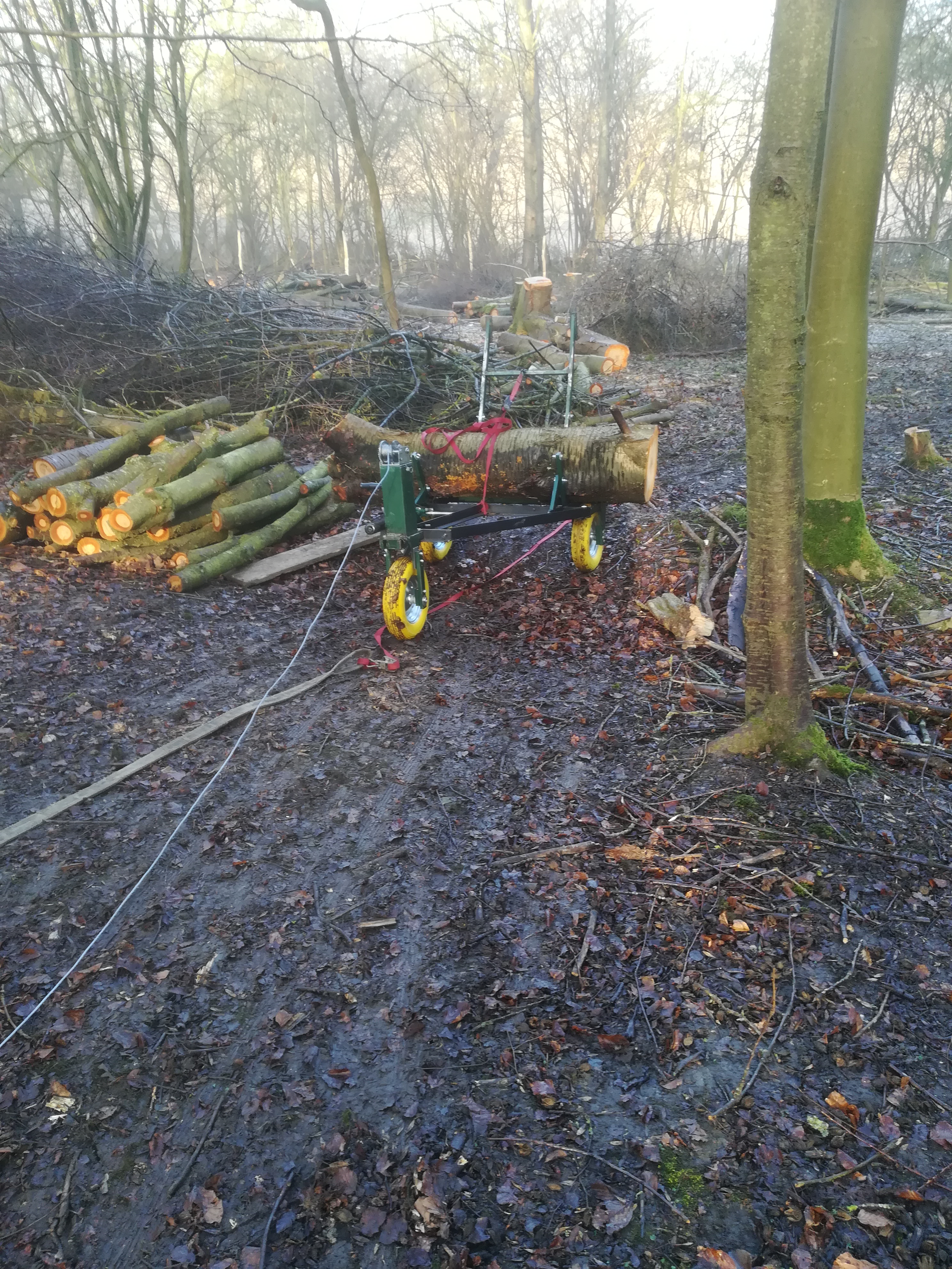 To date I have been using the strengthened log carrier MK 1a and this has been the most effective and reasonably efficient method. Great design but the ground conditions have worked against it recently. The main drawback has been the increasingly sticky mud jamming up the double wheels at the back. The mud is forced between the two sets of tyres and so pushes the wheel itself onto the metal frame making it rub and the whole thing harder to drag along. Bigger wheels, that must be the answer.
