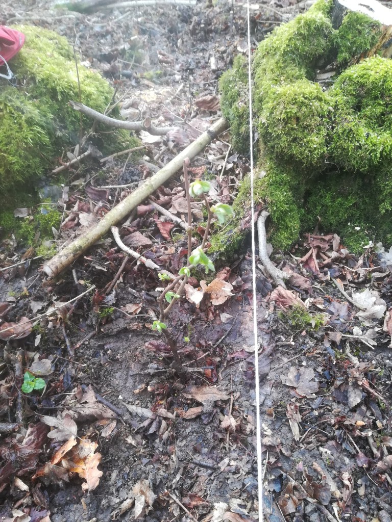 I wasn’t too anxious about having the coppice arithmetically accurate but did set out a couple of planting lines so that we could ensure that the spacing was roughly even across the width and that the spacing between each row was roughly even as well. The aim was to have roughly 4′ – 5′ between each plant.