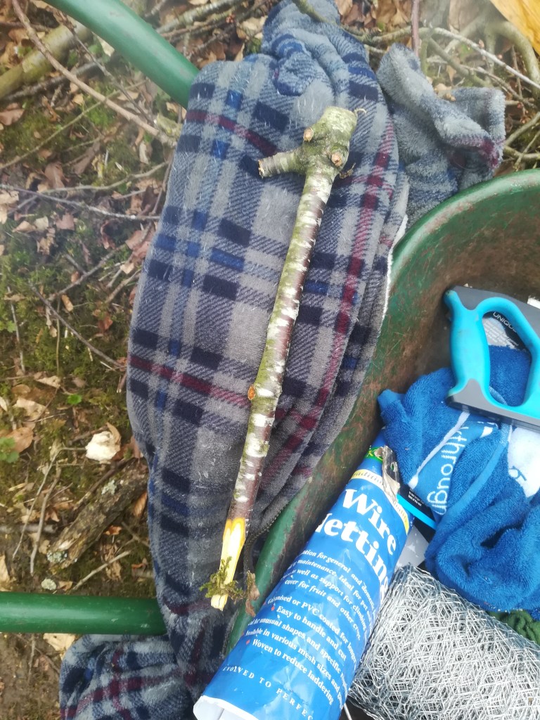 With the deer proof fencing in place (more on that later) it was time to get the hazel whips planted. I had ordered 300 bare rooted whips and they arrived back at the end of January. In order to stop these young plants from drying out I had dug them in within a small enclosure at the top of the wood. They arrive tied in bundles of 25 plants and so it was simply a matter of digging them out and putting them in a plastic bag and carrying them down to the coppice. It is really important that the tiny hair like roots don’t dry out during the handling process. These are the roots that will do all the work once the pant is in the ground, getting it quickly established and allowing the whip to grow away.