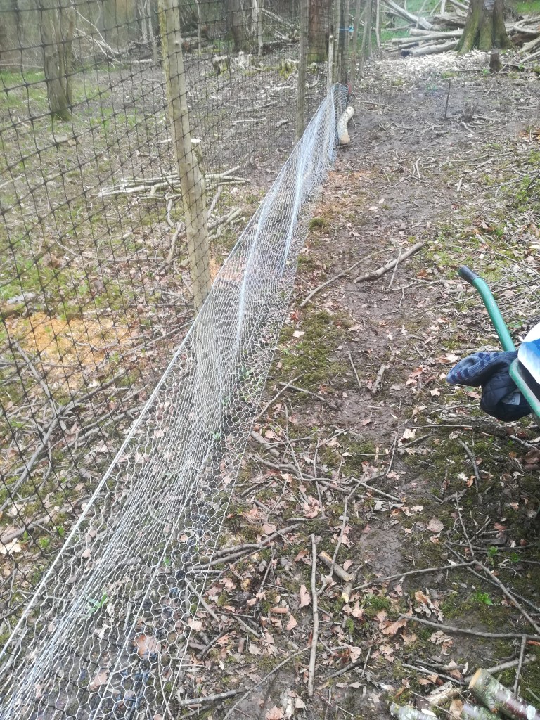 The rest of the week has been spent finishing off the fence by putting a roll of 3′ chicken wire around the bottom of the deer proof fencing . this should help prevent badgers and muntjac from burrowing under. I left and overlap of about 6″ at the bottom of the fence so that it could be pegged down. The pegs were made from parts of the cherry trees that I cut down earlier. Cherry very conveniently branches out along its limbs and has quite pronounce forks which when cut to shape act as perfect pegs. Simply whittle point onto one end and bang them in.