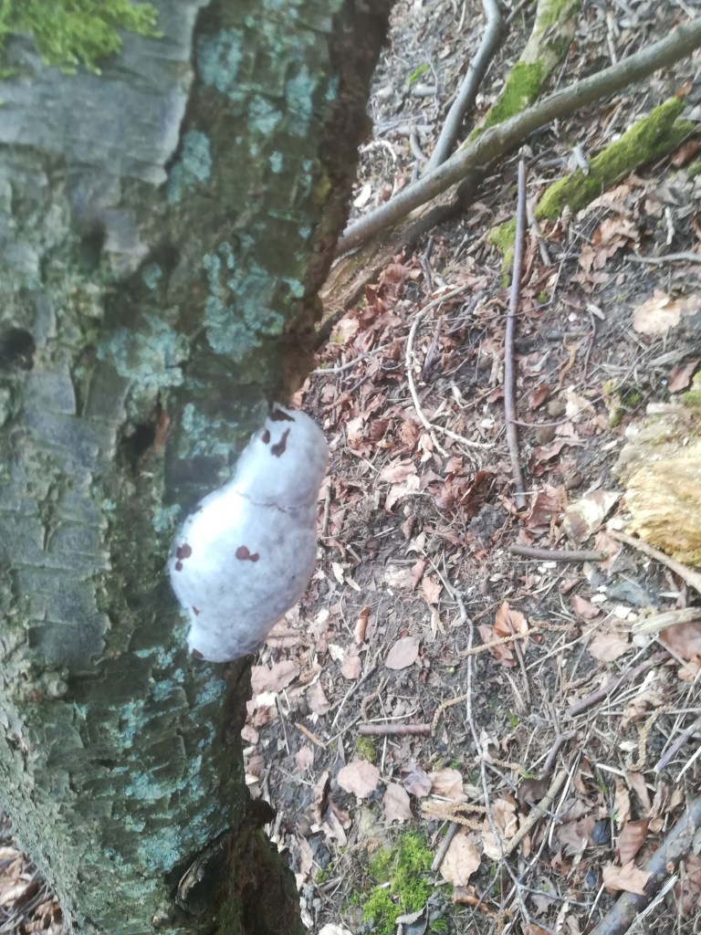 I noticed another, different sort of fungus, this time on a cherry plum tree. It is a hard white mass that appears in single spots/blobs and also appears to establish itself along splits in the bark.