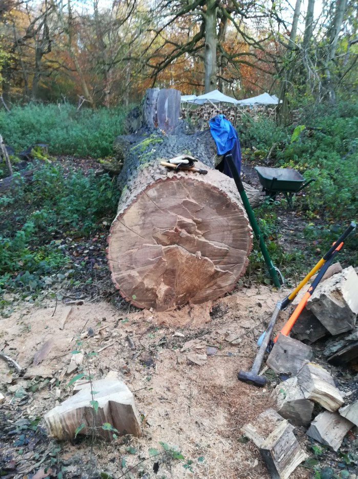 Having cut the last remaining section of the main trunk into manageable lumps I will now complete splitting these lumps into logs and stack for seasoning. A lot of the later stages of the trunk were very heavily knotted and are almost impossible to split by hand. For these bits I have reverted to using the chains saw to cut through the gnarly, twisted grain sections. Whilst this is perhaps wasteful purely from a use of chainsaw fuel and production of sawdust perspective; on balance I think it is far better to go this extra step and produce some very useful firewood from the fallen tree.
