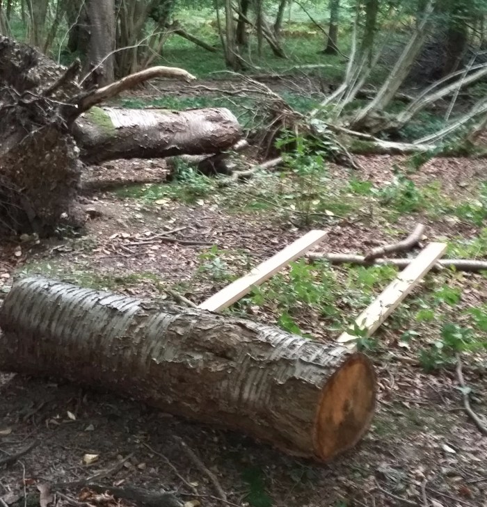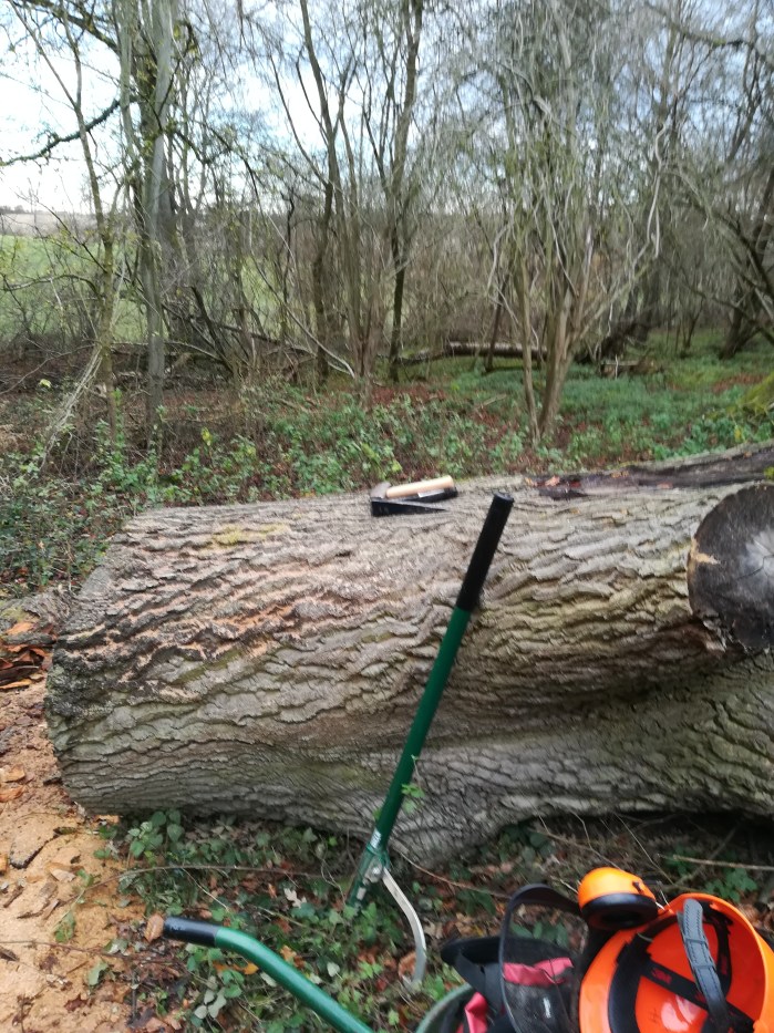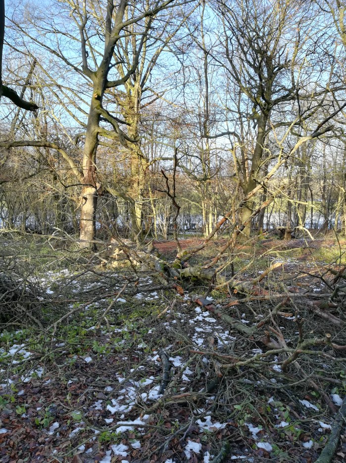 I was confused what had caused the damage as there was nothing obvious at first, the ash trees were too young and therefore too supple to snap under the direct effect of the wind so there must be something else. It took me a while but some way from the trees was a dead branch from a nearby beech tree which must have snapped, fallen onto the trees snapping them before being catapulted off again to lie some distance from the snapped trees. Seems a shame that a dead part of a well established tree can take out a younger tree – net gain zero.