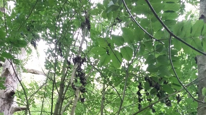 These are called Black Bulgar or Batchelor’s Buttons, this fungus grows in groups on fallen timber. It has black flat-topped discs with brownish tightly rolled over edges when young, and gradually opens up to become more cup-shaped up to 1½” across. It feels rubbery but watch out as the black spores that are produced on the upper surfaces come off and blacken your fingers.